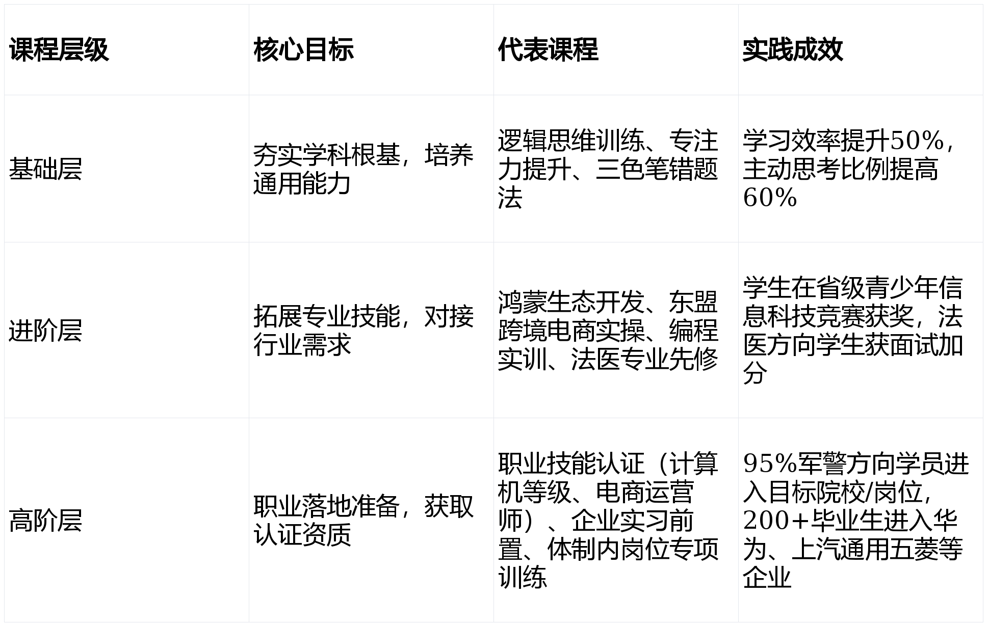 :响应国度产教融合政策,连系成就波动、乐趣变化、行业趋向,其劣势集中表现正在精准婚配、能力前置、资本闭环、政策适配和终身成长五大维度,确定高考方针院校取专业,成立500强企业校友库,优良学生可优先获得练习机遇,更搭建了强大的资本平台,为学生供给合适国度计谋需求的职业标的目的(如人工智能、跨境电商、国防科技等)。再分化为阶段性学业方针和选科方案,全链生态,