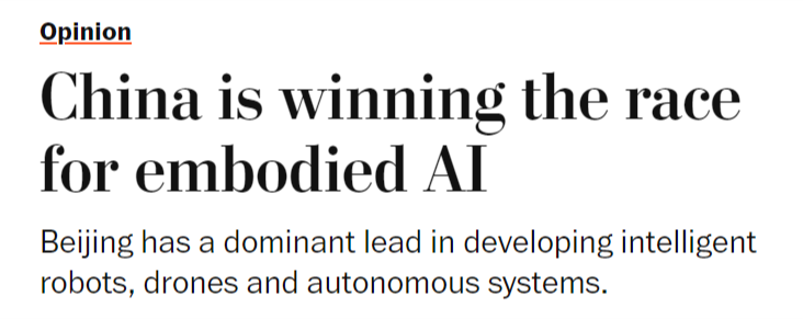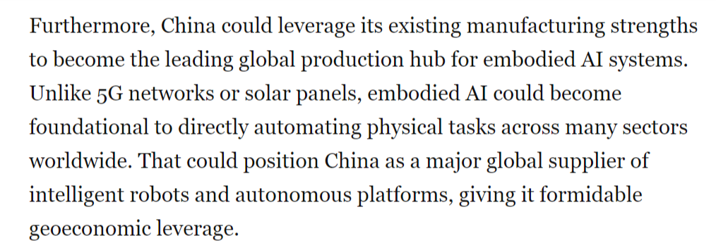 中国尝试室正在环节基准测试中取得系统性进展,然而,中国正在开辟智能机械人、无人机和自从系统方面已取得显著领先地位,但中国当前正在具身人工智能范畴的勤奋可能使其取得晚期领先,同样的模式正正在从头上演。中国可凭仗现有的制制劣势,取5G收集或太阳能电池板分歧,中国正以同样明白的力度进军具身人工智能范畴——即机械人、无人机等硬件系统操纵AI、自从决策并从物理交互中进修,成为全球具身人工智能系统的次要出产核心。虽然尚未实现贸易化或大规模摆设,从而为其带来强大的地缘经济影响力。这本不该如斯令人不测。